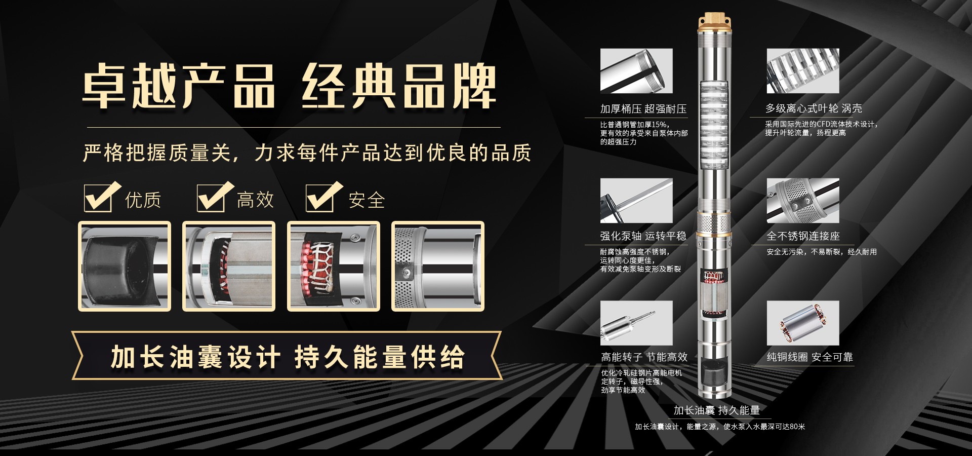 不僅僅是泵,更是流動(dòng)的科技。十多年來(lái),本公司堅(jiān)持走:以質(zhì)量求生存以科技創(chuàng)新求發(fā)展,重合同守信用的道路,生產(chǎn)經(jīng)營(yíng)得到迅速發(fā)展。更希望以后不管從發(fā)達(dá)城市到新農(nóng)村,從工業(yè)制造到尖端科技產(chǎn)業(yè)都隨處可見(jiàn)創(chuàng)江井泵的身影,創(chuàng)江深井泵已成為干萬(wàn)用戶心目中優(yōu)質(zhì)和信心的保證我們將以優(yōu)質(zhì)的產(chǎn)品和最完善的售后服務(wù)來(lái)真誠(chéng)與各界朋友開展廣泛的合作,共同創(chuàng)造一個(gè)美好的未來(lái)!